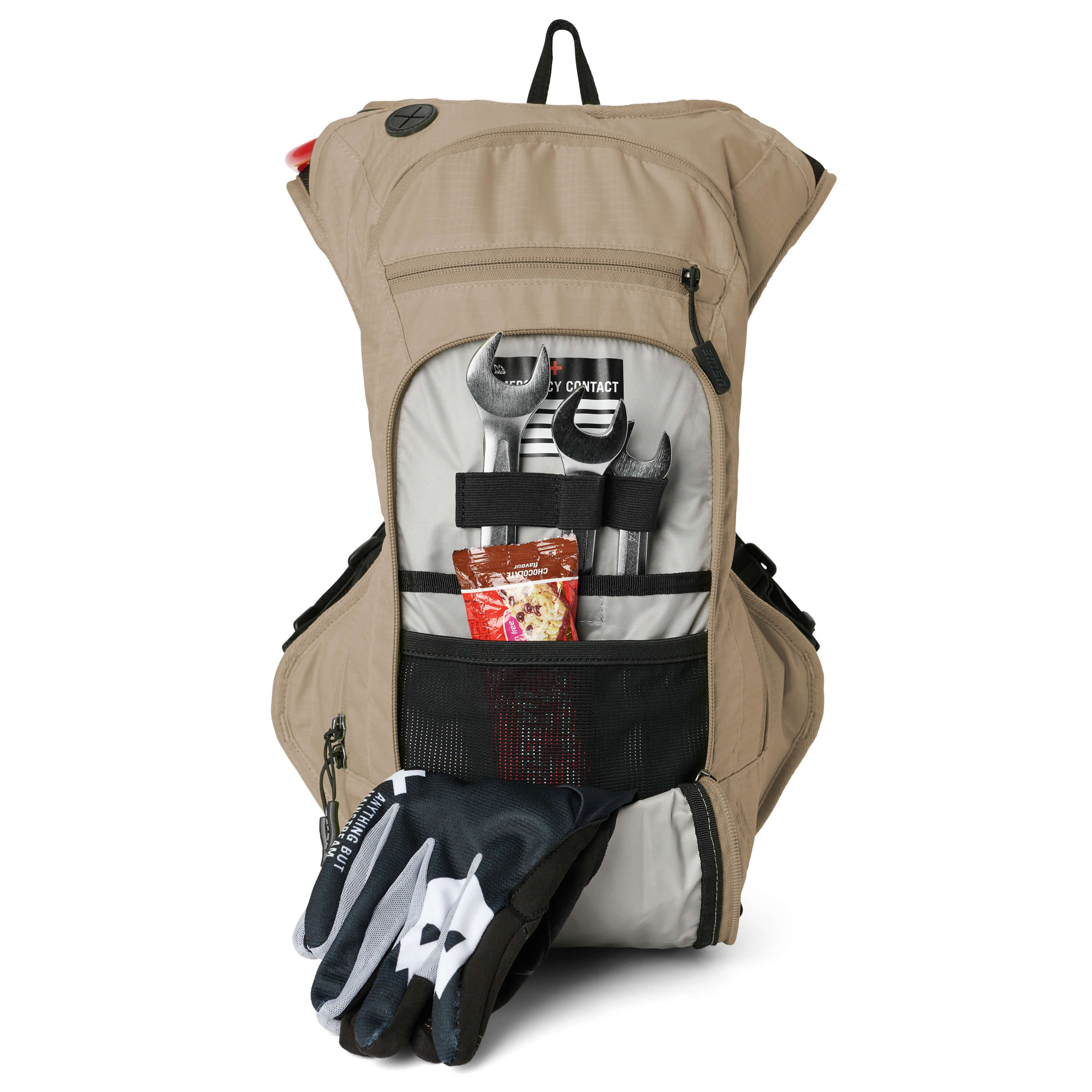 The pack comes with an included 3L / 100oz  Hydrapak Elite™ hydration bladder with a big Slide-Seal top to easily fill it with water and ice. The bladder sits tight thanks to the compression sleeve and the drinking tube attaches easily and securely with the tube clip.