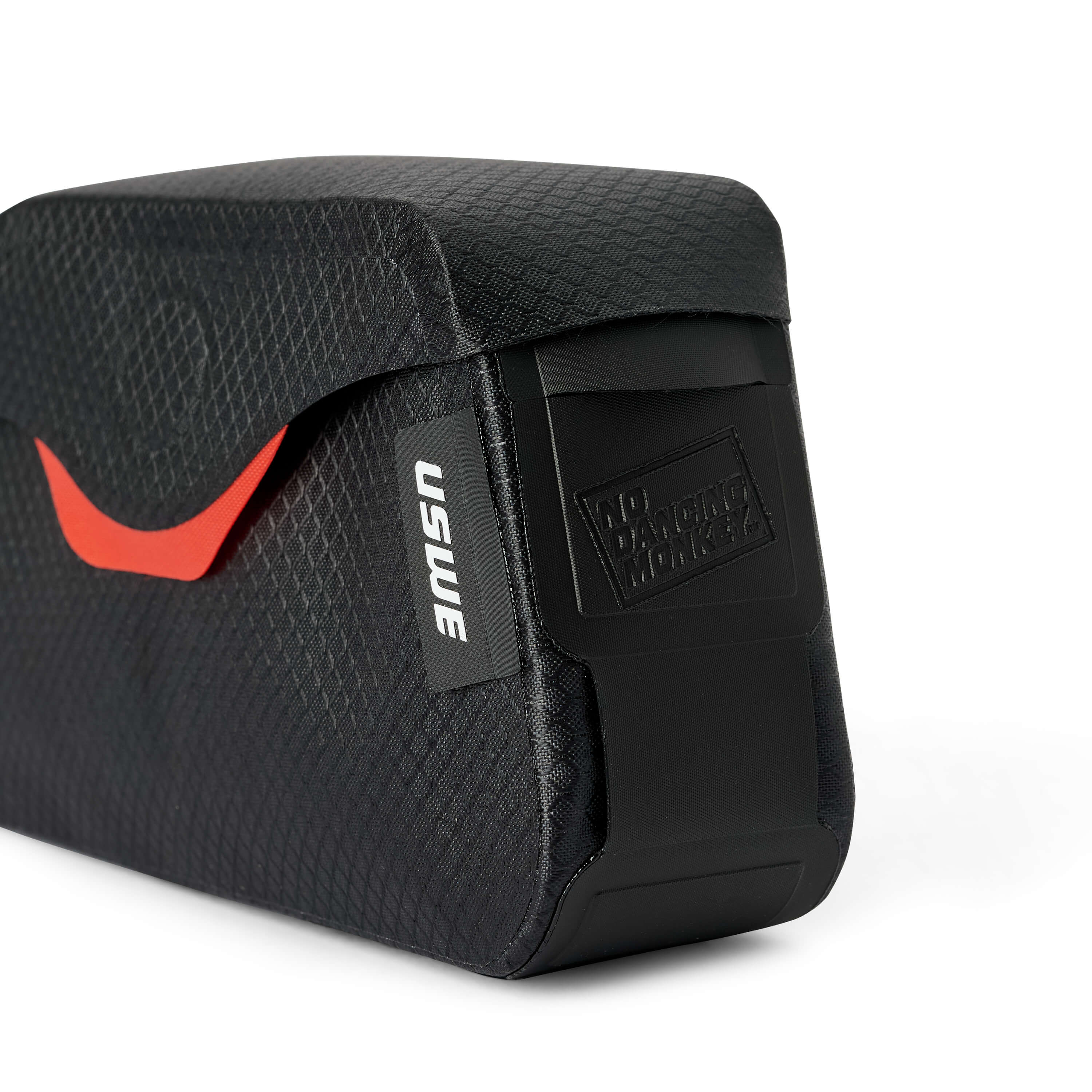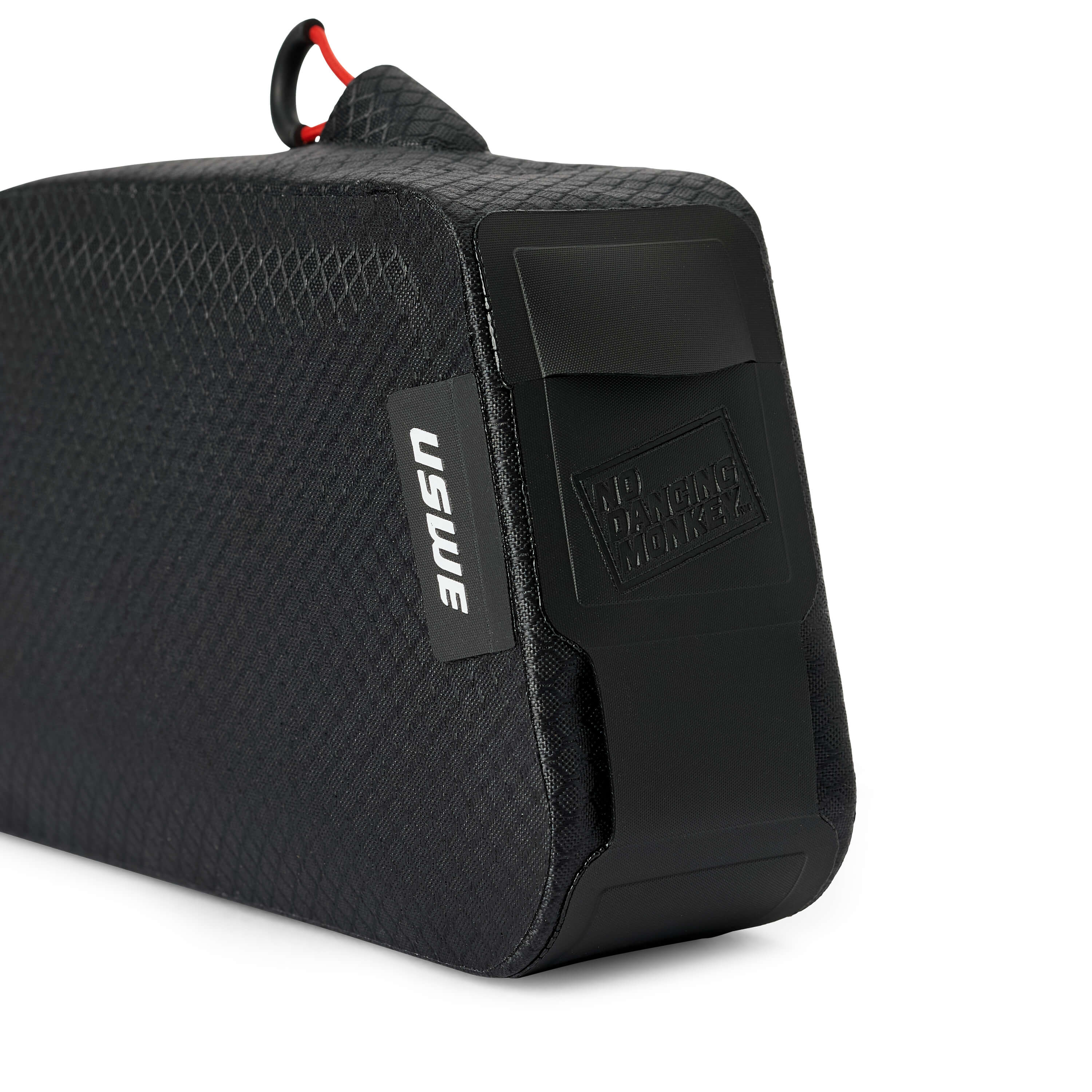 The front of the bag is made from Hypalon and has a port for a charger wire or other cable. The bag is as good as it looks and we have proudly embossed the "No Dancing Monkey" logo on the bag.