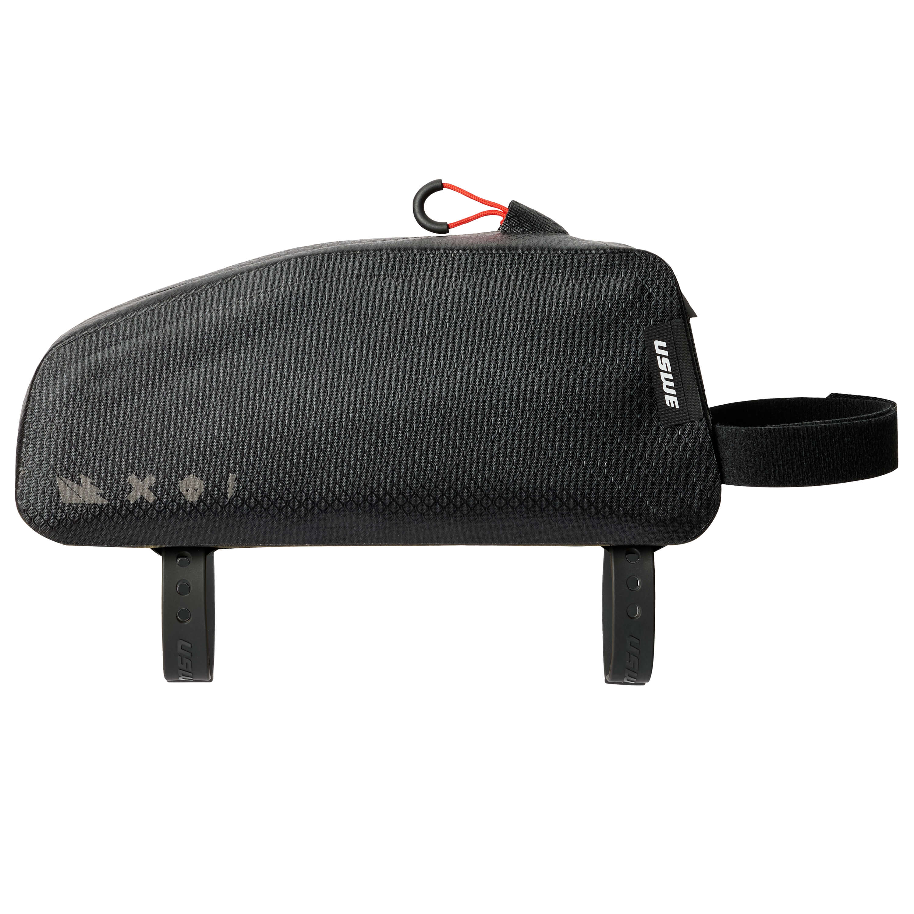 The bag comes with two elastic rubber-like straps, inspired by motorcycle panniers and bike packing nerds, to ensure the bag sits tight and secure on the bike. The bag also comes with 2 Velcro straps of different lengths for maximum compatibility. The attachment points under the bag are made from Hypalon, making the attachment points flexible and compatible with USWE frame bags.